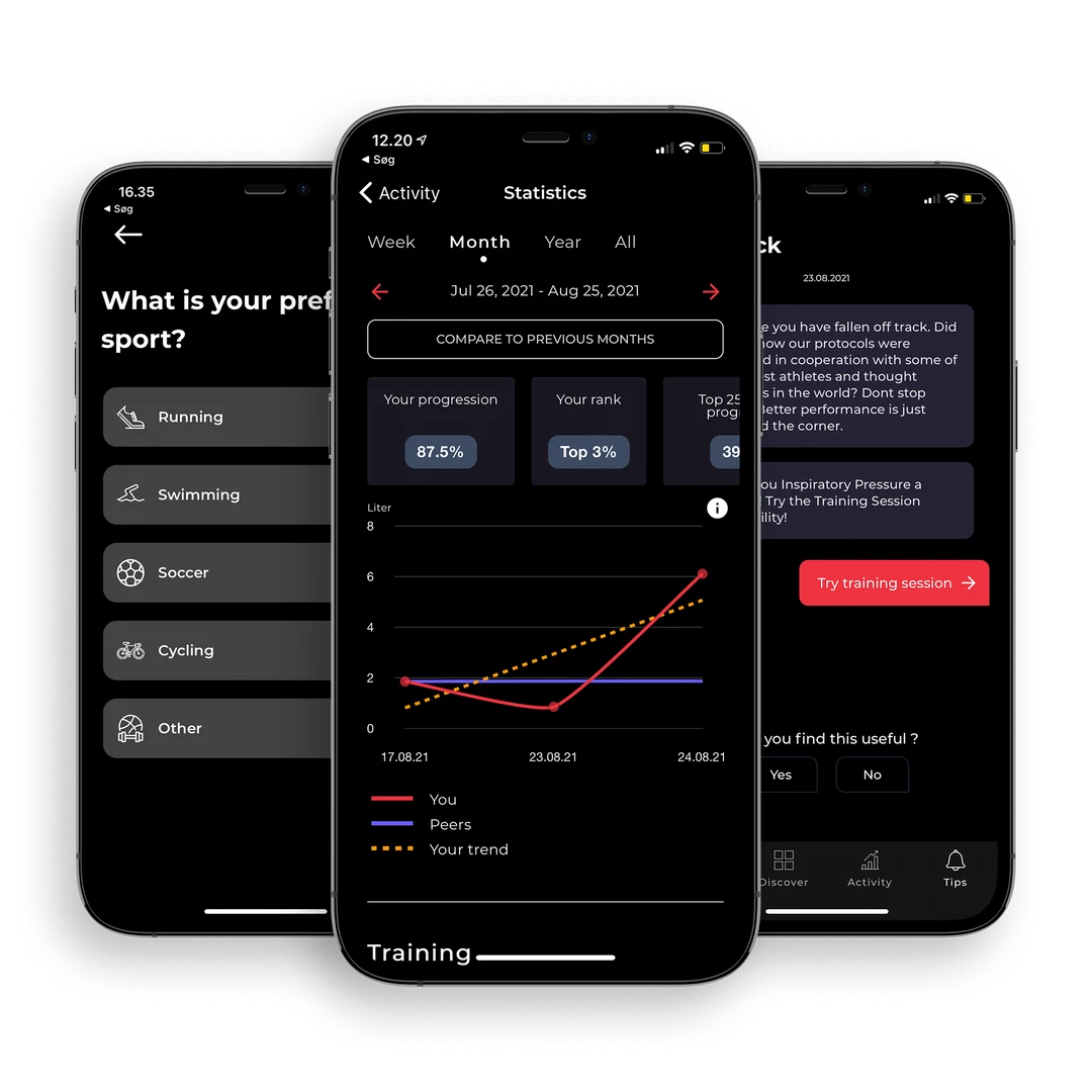 The app acts as a virtual breathing coach, giving you live feedback and ensuring all exercises are performed correctly since you see the level of your compliance. The access to your training data gives an overview of your progress over time.