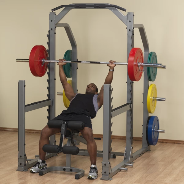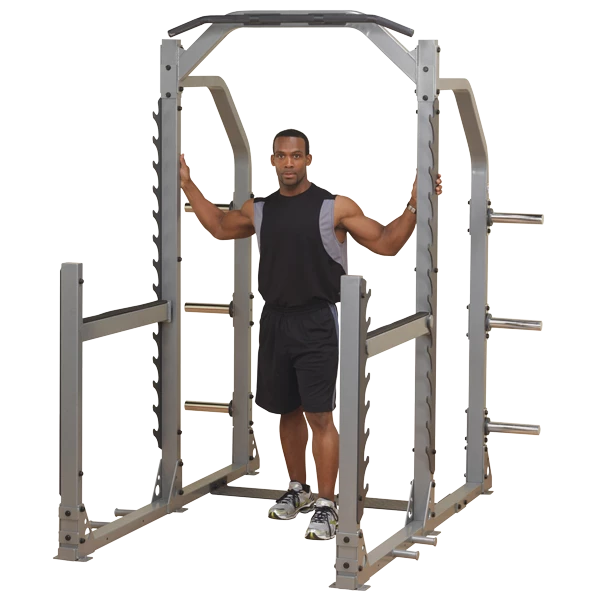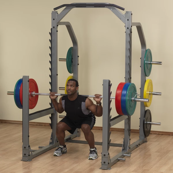 ¼” solid steel gun rack style liftoffs provide multiple positions for a comfortable starting position. Rock solid adjustable safeties allow users to workout safely and maximize their load. The 2”x3” 11-gauge steel frame holds up in any heavy use environment. The back frame is extended to allow spotters easy access. Integrated weight storage keeps the plates right where you need them. The SMR1000 has integrated pegs for strength bands for extreme plyometric training. The integrated chinning bar allows users to incorporate pull ups, chin ups, inversion, ab slings and other body weight resistance systems for amazing versatility. The SMR1000 is an uncompromised monster free weight system. The SMR1000 Muti-Rack system is perfect for heavy use, heavy load environments, like schools, military, police and fire departments.