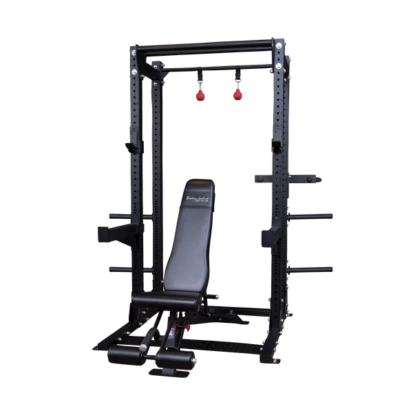 The SPR500BACKP4 package features Body-Solid’s SPR500 Commercial Half Rack as well as the Half Cage extension, SFID425 bench, SR-DIP Dip Station Attachments, SR-CB Cannonball Grips and SPRDCB Dual Chin Bar.
