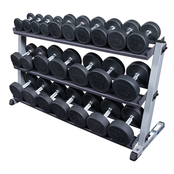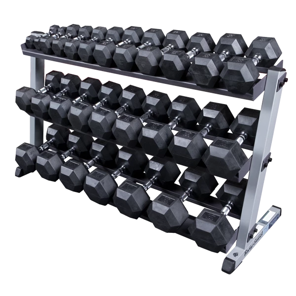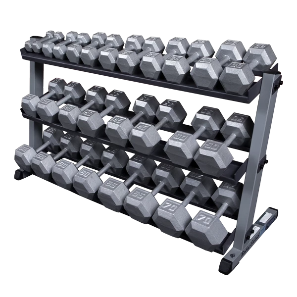 Allows storage of up to 70 lb. hex dumbbell pairs. Featuring heavy-duty construction for maximum strength and stability. Exclusive slant back design makes storage and retrieval a breeze.