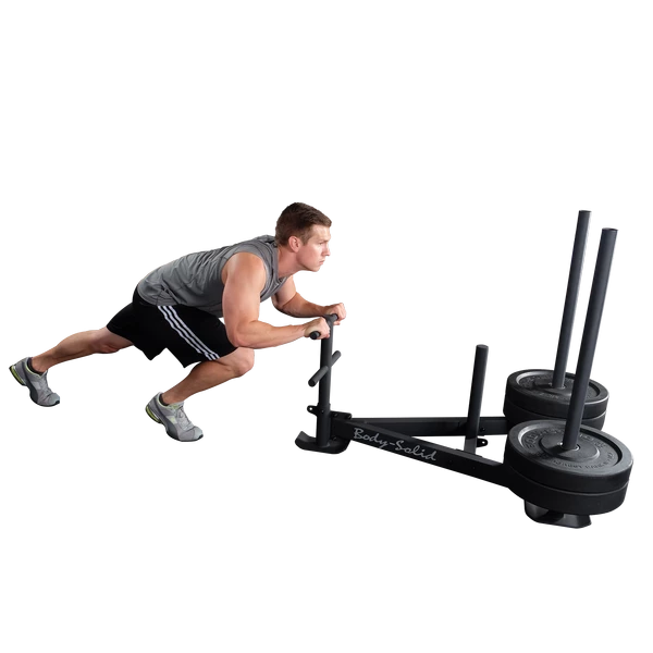 Body Solid’s GWS100 Weight Sled features a durable heavy-gauge solid steel mainframe. Along with the center weight post, the removable posts double as weight plate posts. Multiple attachment anchors allow you to attach almost any vest or belt giving this sled unmatched versatility. Vertical and horizontal hand posts offer several positions on both sides for pushing and pulling exercises.