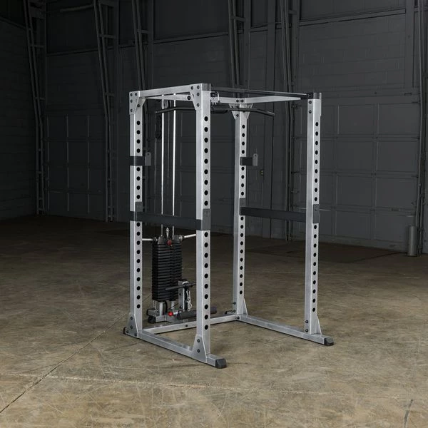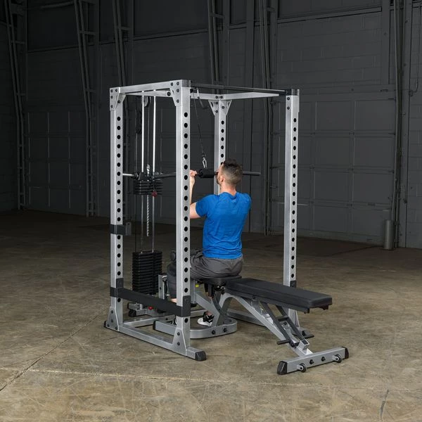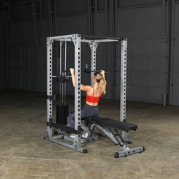 Transform your Body-Solid Power Rack into a multi-workout machine. This Lat Attachment will help you build a wider, beefier Back and/or stronger and bigger Biceps and Triceps. Features nylon coated, aircraft quality (2200 Lb. test) cables. The Plate-Load carriage on this Lat Attachment features 1″ diameter weight posts that will accommodate Standard or Olympic Weight Plates. Includes Lat Bar and Low Row Bar.