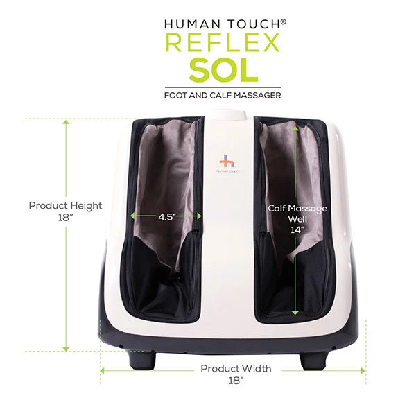 The Human Touch® Reflex SOL Foot and Calf Massager incorporates CirQlation and Figure-Eight technologies that are designed to emulate those of a professional masseuse. Massaging the feet and calves in an upward, rolling, or wave-like motion, and forcing blood away from the feet and toward the core of the body, helps to improve circulation.