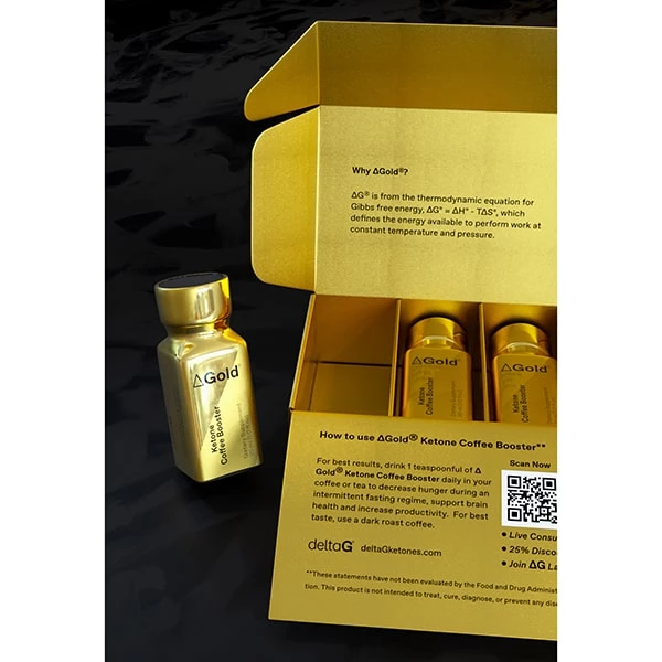 Our revolutionary Oxford Ketone Ester is unique in its potency, maximizing Ketone levels in the blood and providing a powerful fuel source that augments physical performance, sharpens mental acuity, and supports your metabolic health. Demonstrated in human scientific studies, deltaG the Oxford Ketone Ester shows immense potential to support brain health, well-being and vitality. A teaspoonful of deltaGold™ Ketone Coffee Booster in your morning coffee decreases hunger to assist weight management, allowing you to remain in a fasted state during an intermittent fasting regime. deltaGold™ Ketone Coffee Booster will fuel your brain and body to enhance your workday productivity.