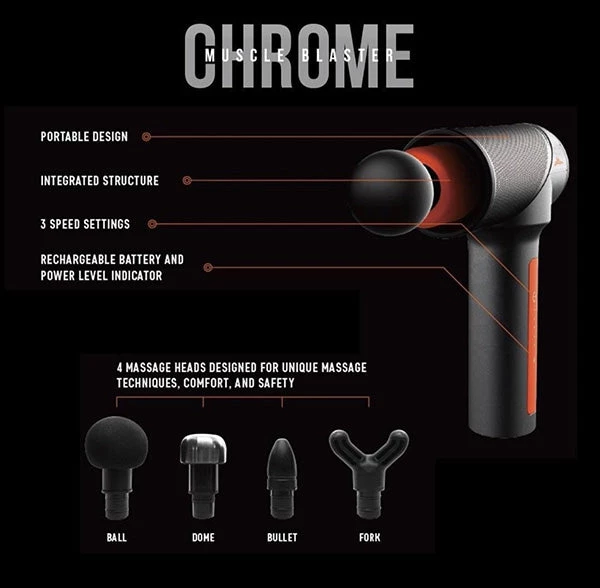 The Muscle Blaster Chrome provides a deep tissue massage to increase lymphatic flow and reduce lactic acid. It also helps relieve muscle fatigue, soreness, spasms, and stiffness.