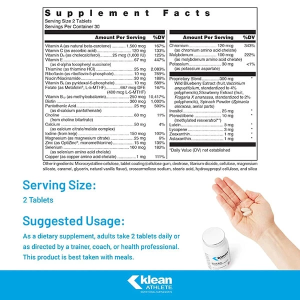 Klean Multivitamin is specially formulated for the unique needs of athletes. Vitamins and minerals play vital roles in maintaining health and are essential for proper metabolism of fats, proteins, and carbs to provide fuel for training and competition. These functions help support post-workout muscle restoration. Klean Multivitamin has been carefully created to contain the proper proportion of vitamins, minerals, trace elements and other nutrients. Its unique fruit and vegetable blend, along with antioxidants such as lutein, lycopene, zeaxanthin, astaxanthin and pterostilbene, are not typically found in other multivitamins, making Klean Multivitamin a one-of-a-kind ally in an athlete’s ongoing quest for optimal health and performance.