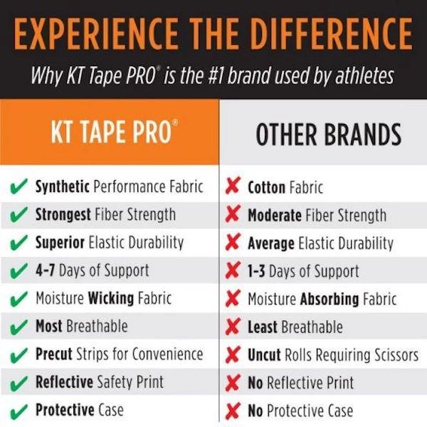 KT Tape Pro fibers feature a stronger elastic core which delivers better support for muscles, joints and tendons without restricting comfort and range of motion. This improved elastic core retains its elasticity far better over time and provides more durable support than cotton kinesiology tape, lasting as long as you need it. Like top athletes, it relies on both strength and endurance to get the job done.