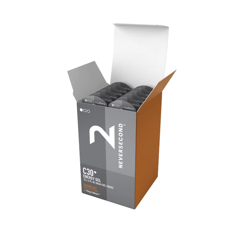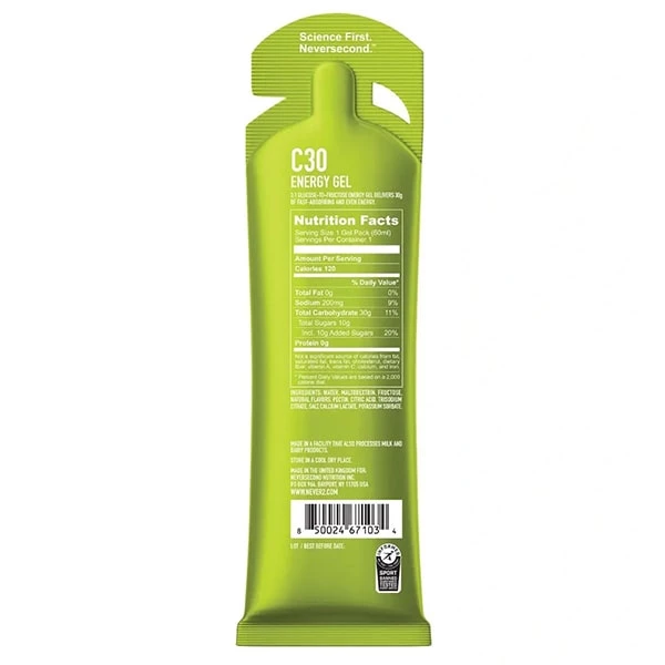 Our C30 Energy Gel delivers 30g of carbohydrate for fast-absorbing energy. Can be taken with or without water. Mild flavor and thin viscosity reduce the opportunity for GI discomfort, even during hard sessions and races. Use can be further personalized in conjunction with NEVERSECOND Guidance Systemâ„¢.