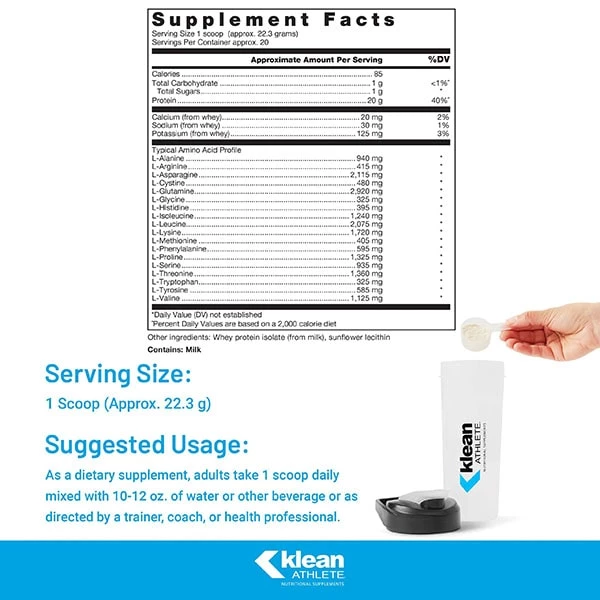 Klean Isolate is an unsweetened, unflavored clean whey protein isolate that can be easily added to any beverage or recipe to enhance daily protein and amino acid intake.