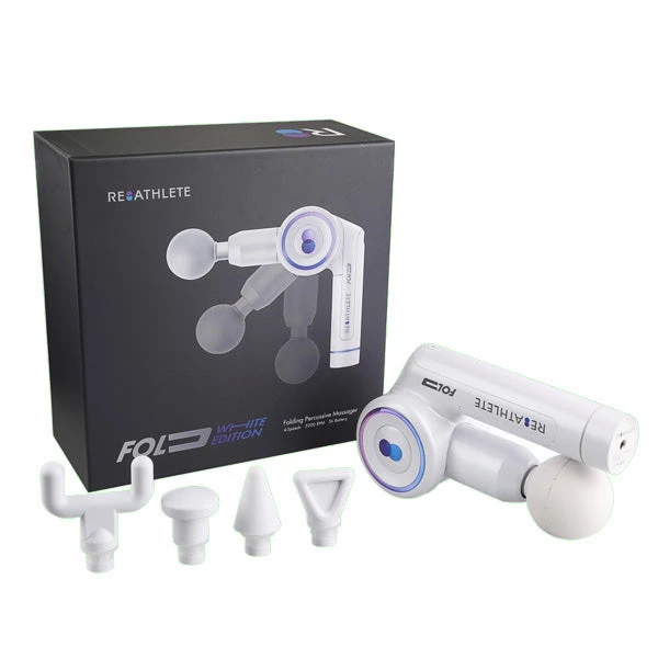 The brand-new FOLD Percussion Massager from ReAthlete provides a professional-grade massage in a compact and stylish body. With 5 specialized heads, 4 powerful speeds, and foldable design, the FOLD is the perfect tool for any athlete. Recover faster and come back stronger with the power of percussion massage. The interchangeable set of specialized heads allow you to tailor your massage to your needs and the adjustable arm allows you to reach any part of your body. The FOLD’s long-lasting battery makes this the perfect portable massager and the quiet motor means you won’t be bothering anyone at the gym.