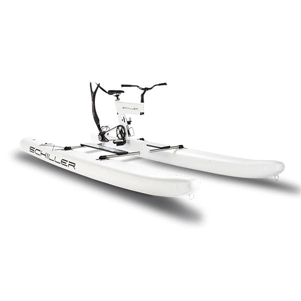 The Schiller Water Bike features two rugged, high pressure, drip-stitch pontoons, along with a frame designed to support up to 300lbs. The integrated steering handlebars and low-level drag outdrive makes riding on water a blast!