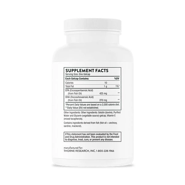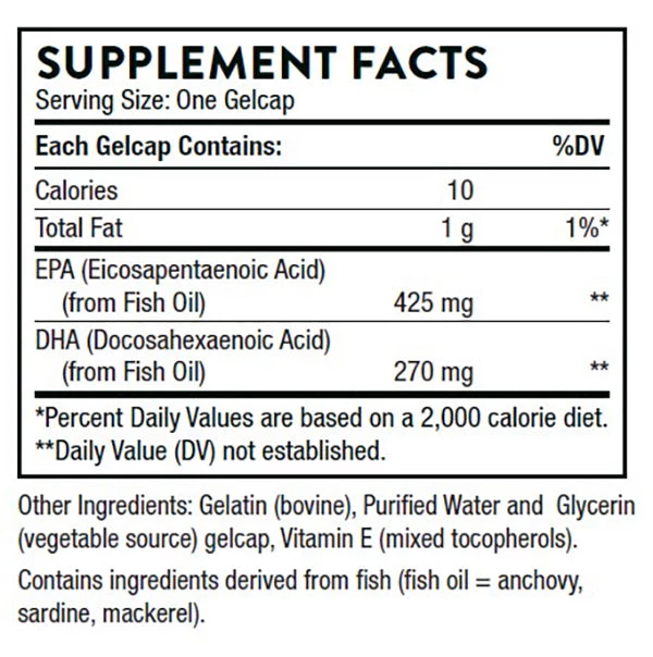 Thorne’s Super EPA is NSF Certified for Sport®. The two most important omega-3 fatty acids from fish – EPA and DHA – are beneficial for the cardiovascular system.* These two fatty acids support good circulation by promoting healthy blood vessels, enhancing blood flow by optimizing vascular endothelial function, and maintaining already normal triglyceride and cholesterol levels.* They also support healthy brain function, cognition, and mood.* Thorne’s Super EPA, a best-selling product for more than two decades, provides the highest quality, purest fish oil available. Molecular distillation is utilized to ensure the removal of cholesterol and contaminants from the raw ingredients, including PCBs and heavy metals. Super EPA is NSF Certified for Sport®.