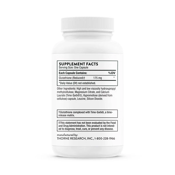 Thorne’s Glutathione is NSF Certified for Sport®. It occurs naturally in cells and is a cofactor in dozens of enzymatic reactions involved in detoxification.* As an antioxidant, glutathione directly quenches several reactive oxygen species (free radicals).* The body’s benefits from maintaining a normal level of glutathione include support for liver function, pulmonary function, immune function, bowel health, carbohydrate metabolism, cardiovascular health, cognitive health, and eye health.* Glutathione-SR is a breakthrough in glutathione supplementation because its sustained-release formula protects it from stomach acid and digestive enzymes, allowing for a slower release and a more steady level in the bloodstream of this essential nutrient.*