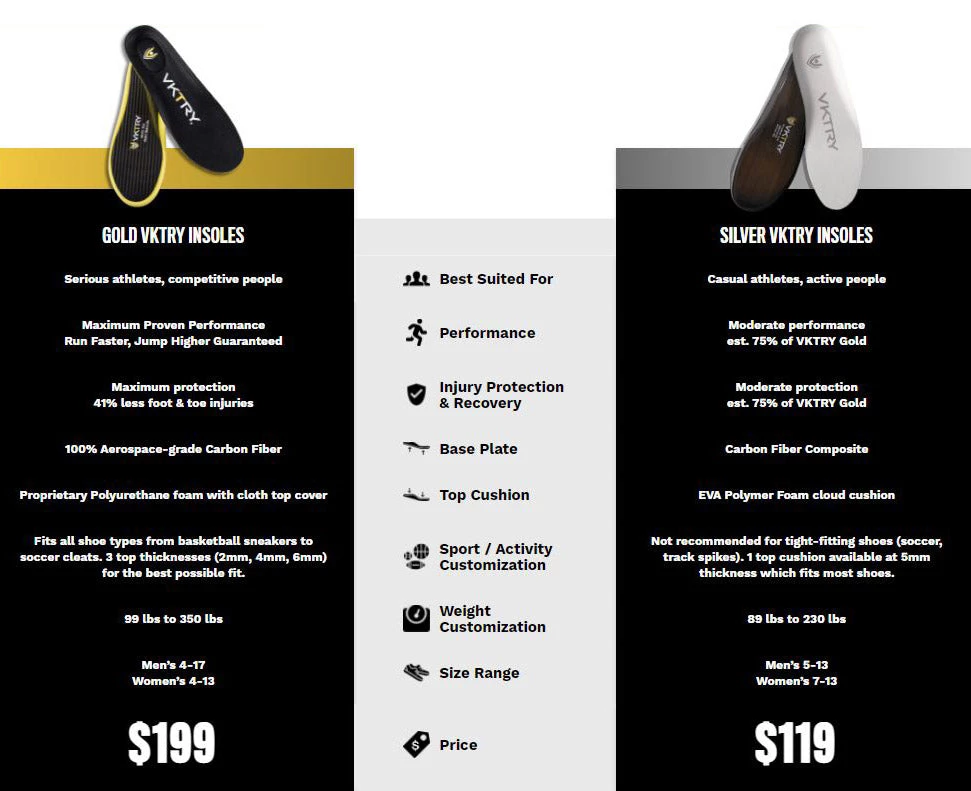 All athletes are not alike. Using body weight and foot size, VKTRY’s proprietary algorithm determines optimal ‘Pro’ level (flexibility) based on how much deflection force an athlete can comfortably exert on the VKTRY carbon fiber insole. This energy is stored (like a spring) and released back to literally propel the athlete forward or upward.