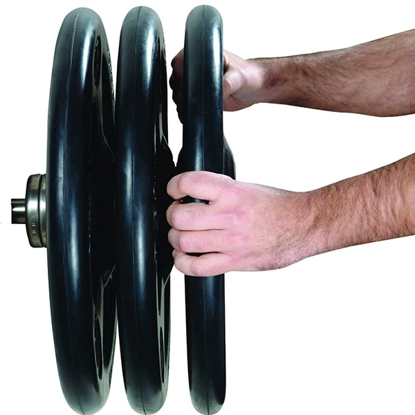 The ISO-Grip Plate is the industry’s answer to a 360-degree easy-pick-up plate cleverly achieved by casting the hub thicker than the rim. The patent-pending, radical benefit of a thicker hub and a streamlined rim is the anti-pinch nature of using the plates. The streamlined rim ensures a comfortable grip and enhanced maneuverability with its 3-grip design. The steel composite casting coating makes these plates highly durable. Perfect for school weight rooms, in-home gyms, and commercial settings.
