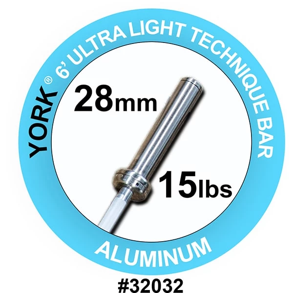 The Ultra-Lite Aluminum Weight lifting bar is 28 mm diameter, 6’bar and weighs 15lbs but is significantly reduced in weight so that the trainee can focus 100% on form and not the weight of the bar. The York Barbell Ultra-Lite Aluminum barbell is a great teaching tool for school weight rooms, sports performance centers, home gyms, and commercial gyms.